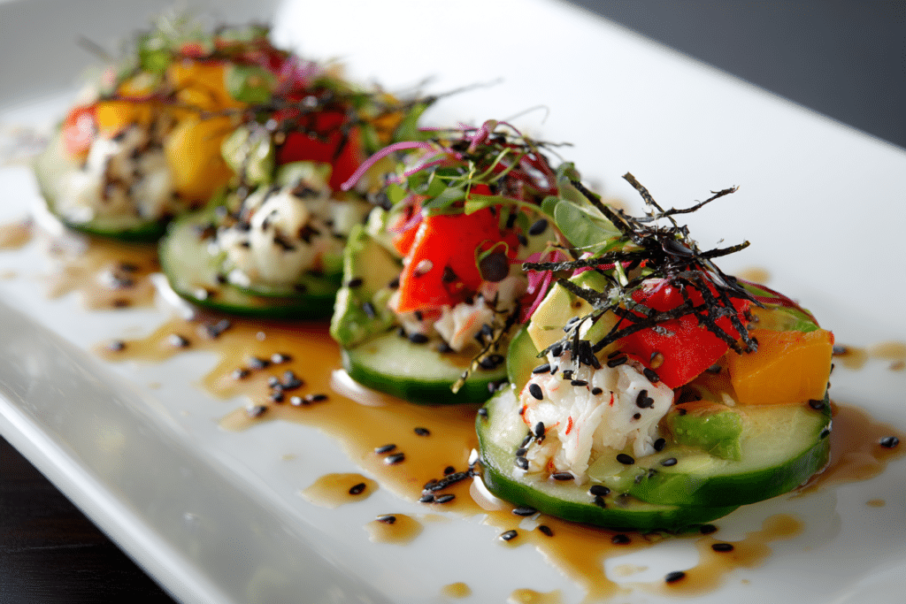 Easy California Roll Cucumber Salad captures the essence of a California sushi roll in a vibrant, crunchy salad form. Crisp cucumbers, creamy avocado, sweet imitation crab, and a hint of …
