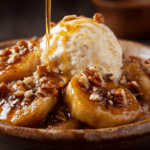 Banana Foster with Pecans & Caramel is a dessert that’s both dramatic and deeply comforting. Originating from New Orleans, this rich, skillet-cooked treat features bananas bathed in a bubbling butter-rum caramel sauce, flamed for flair, and finished with toasted pecans for crunch. Served warm over ice cream, it’s indulgence in its most glorious, gooey form.