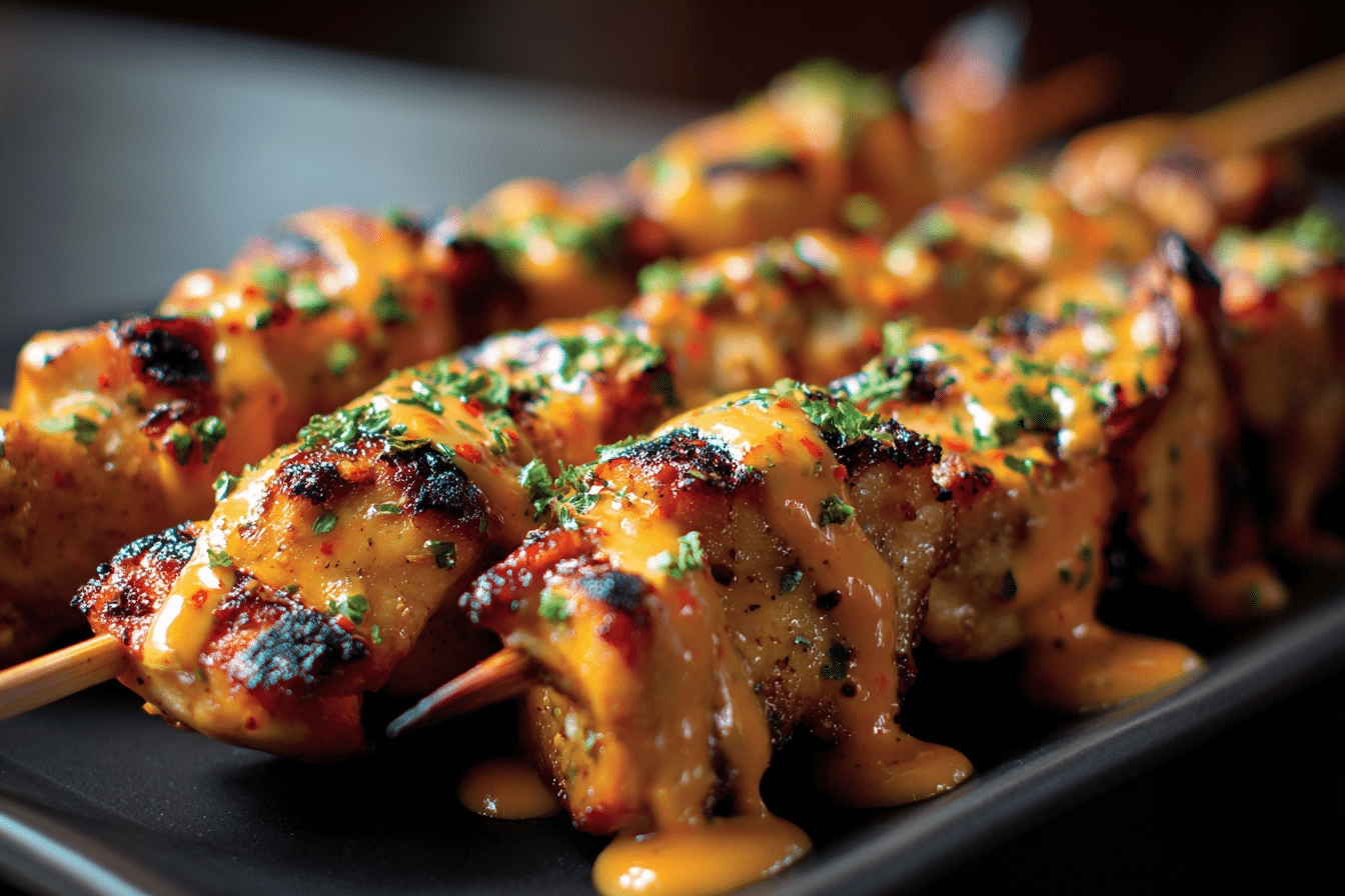 Tender grilled chicken skewers coated in a creamy sweet-spicy bang bang sauce with lightly charred edges and bold flavor.