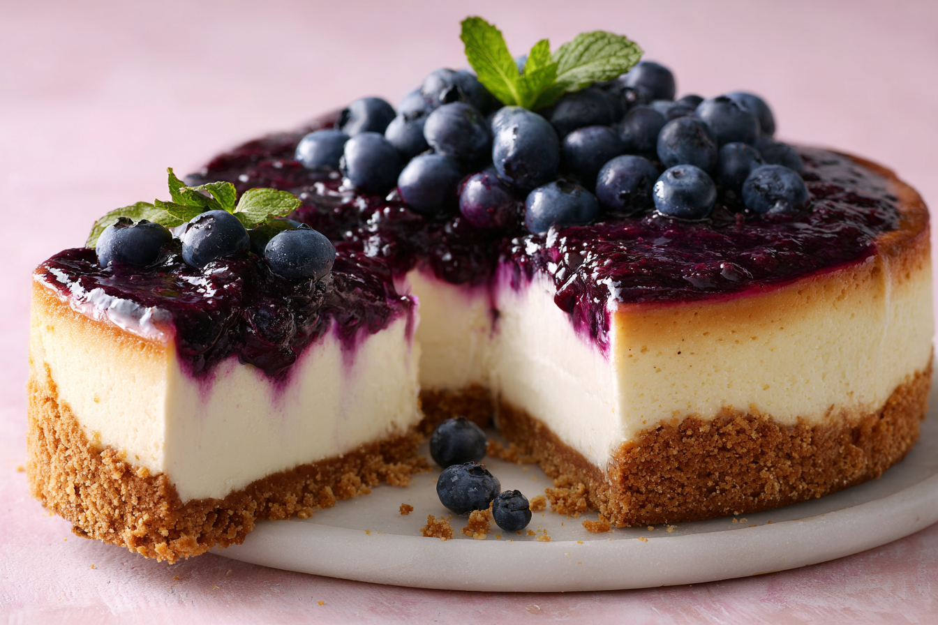 While indulgent, this cheesecake includes antioxidant-rich blueberries and the option to use lighter dairy or alternative flours for a slightly more balanced treat.