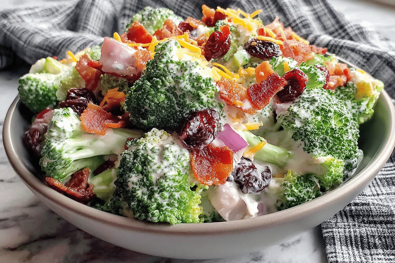 Broccoli salad with bacon, creamy dressing, dried fruit, and crunchy seeds, creating a balanced cold side dish for gatherings and meals.