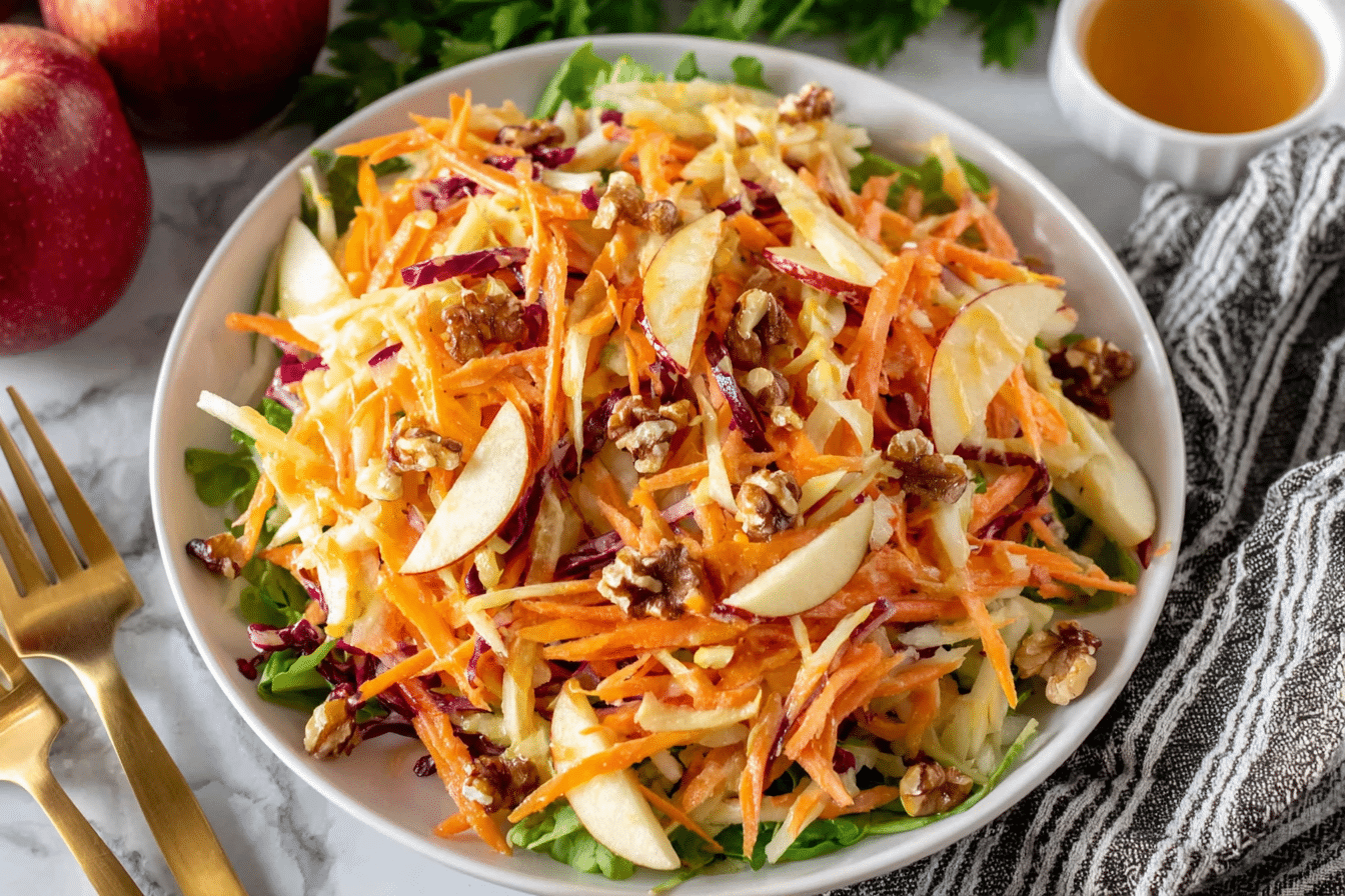 The sweetness of apples pairs beautifully with the earthy flavor of shredded carrots, while a light dressing made with lemon juice or apple cider vinegar brings brightness and balance. Optional ingredients like raisins, walnuts, or a hint of honey enhance texture and depth, transforming this simple salad into a versatile, crowd-pleasing dish.