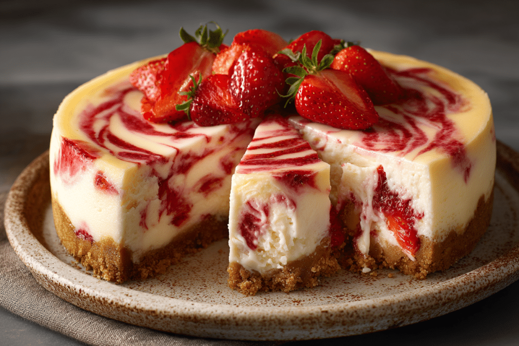 Strawberry Swirl Cheesecake is the kind of dessert that turns heads. With its luscious, creamy filling and eye-catching ruby-red strawberry ribbons, it’s as visually striking as it is delicious. This …