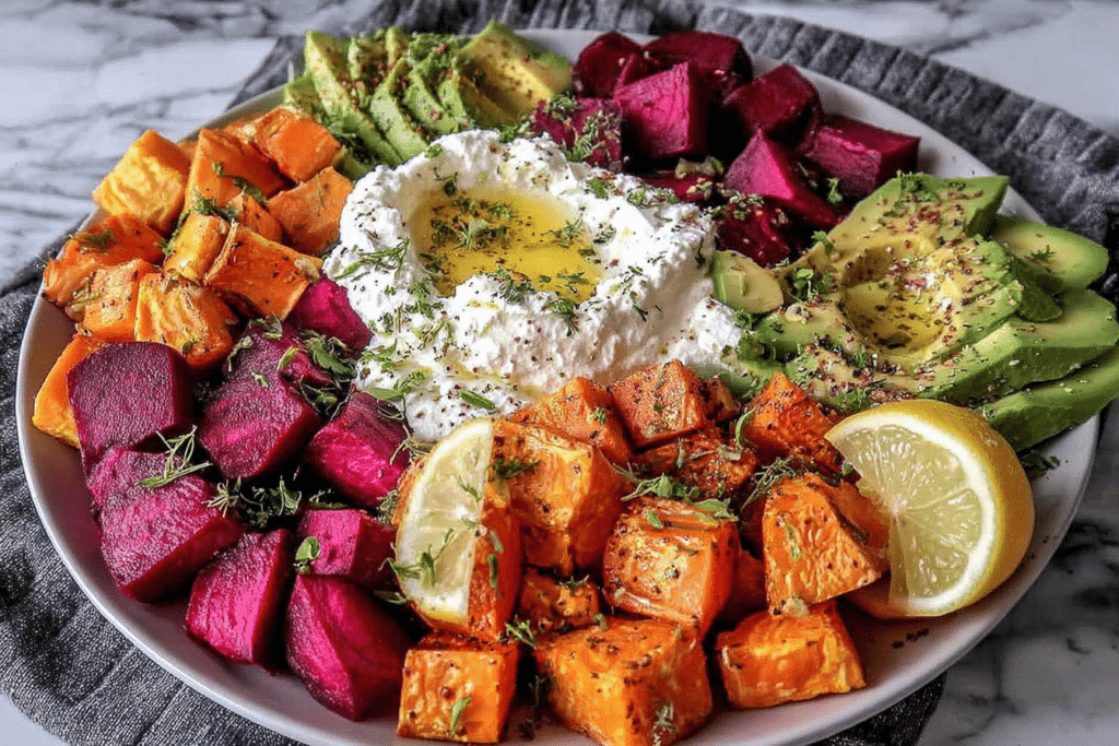 Roasted Beet, Sweet Potato & Avocado Salad with Whipped Ricotta & Lemon-Tahini Drizzle is a vibrant, nourishing dish that combines earthy roasted beets and sweet potatoes with the creamy, buttery …
