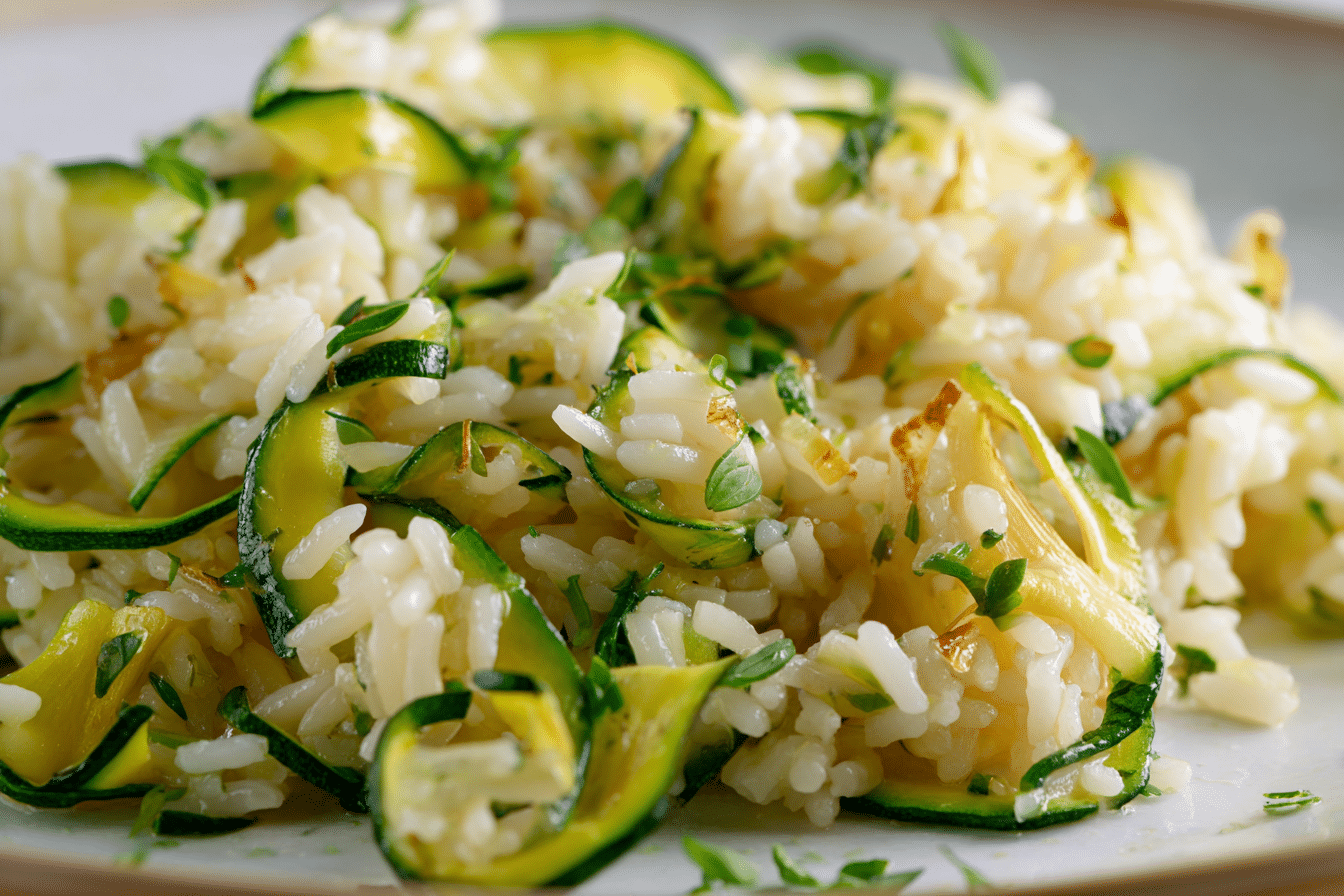 A light and vibrant summer dish combining tender zucchini, fluffy rice, and fresh herbs, enhanced with olive oil, lemon zest, and optional Parmesan or nuts.
