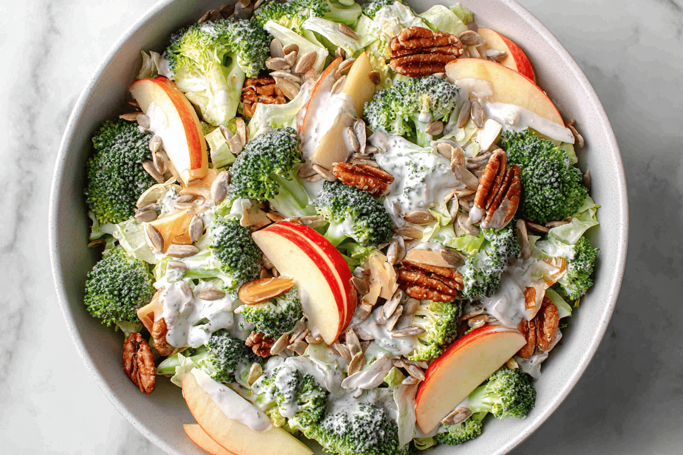 This salad stands out because of the contrast in textures. Crunchy broccoli florets pair with juicy Honeycrisp apples, creating a bite that feels both fresh and satisfying. The natural sweetness of the apples lifts the earthy flavor of broccoli.