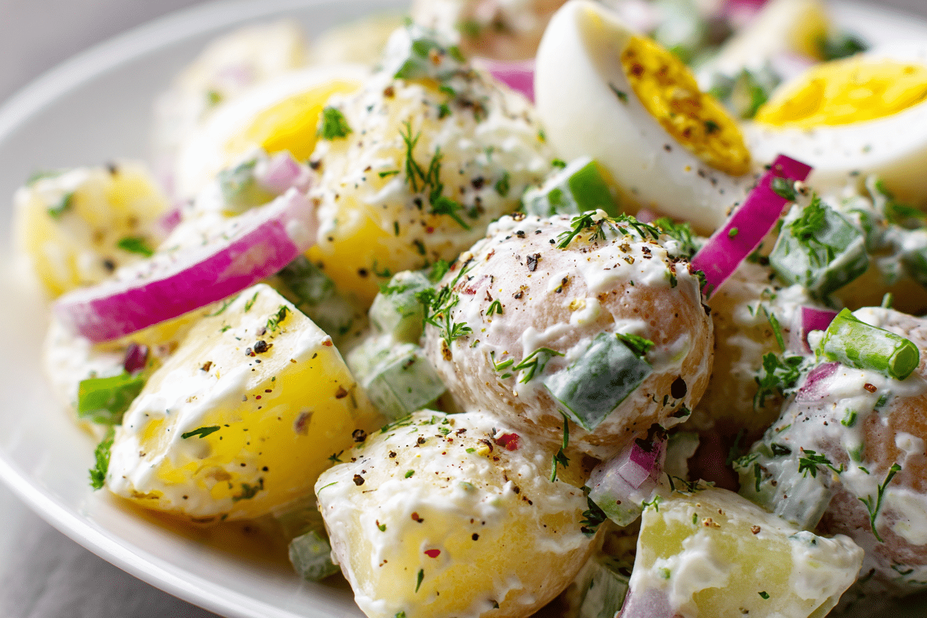 The dressing is a combination of mayonnaise, Dijon mustard, and a touch of vinegar, producing a smooth, tangy coating that brings all the ingredients together. Hard-boiled eggs add richness, while bacon crumbles (optional) contribute smoky depth and texture. Fresh parsley or chives provide brightness, making the salad visually appealing as well as flavorful.