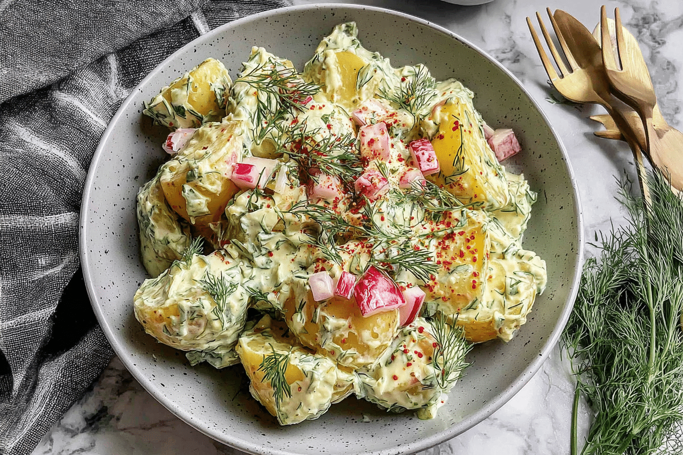 Creamy dill potato salad with tender potatoes, fresh herbs, and tangy dressing, perfect for picnics, barbecues, and easy meals.