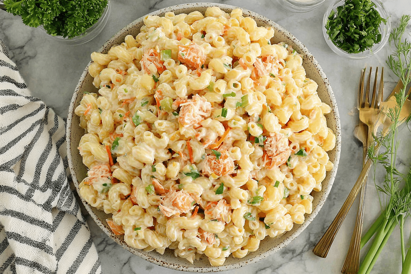 Creamy Hawaiian-style macaroni salad with tender pasta, lightly sweet dressing, and crisp vegetables, perfect for chilled meals and gatherings.