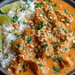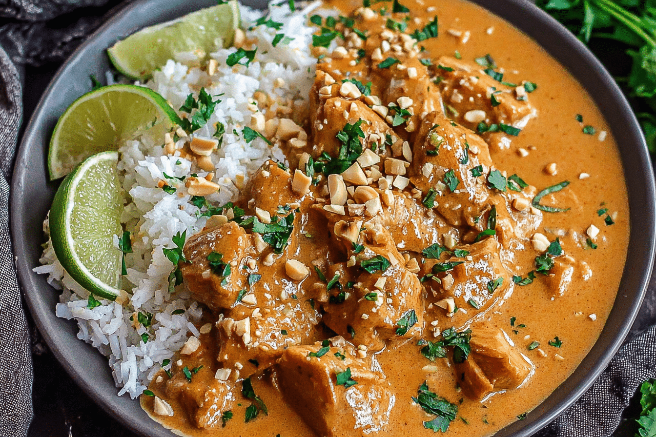 This meal carries a balance of nutty peanut butter, light coconut milk, garlic, and a hint of spice. As it cooks, the sauce thickens slightly and coats each piece of chicken with smooth texture and deep flavor.