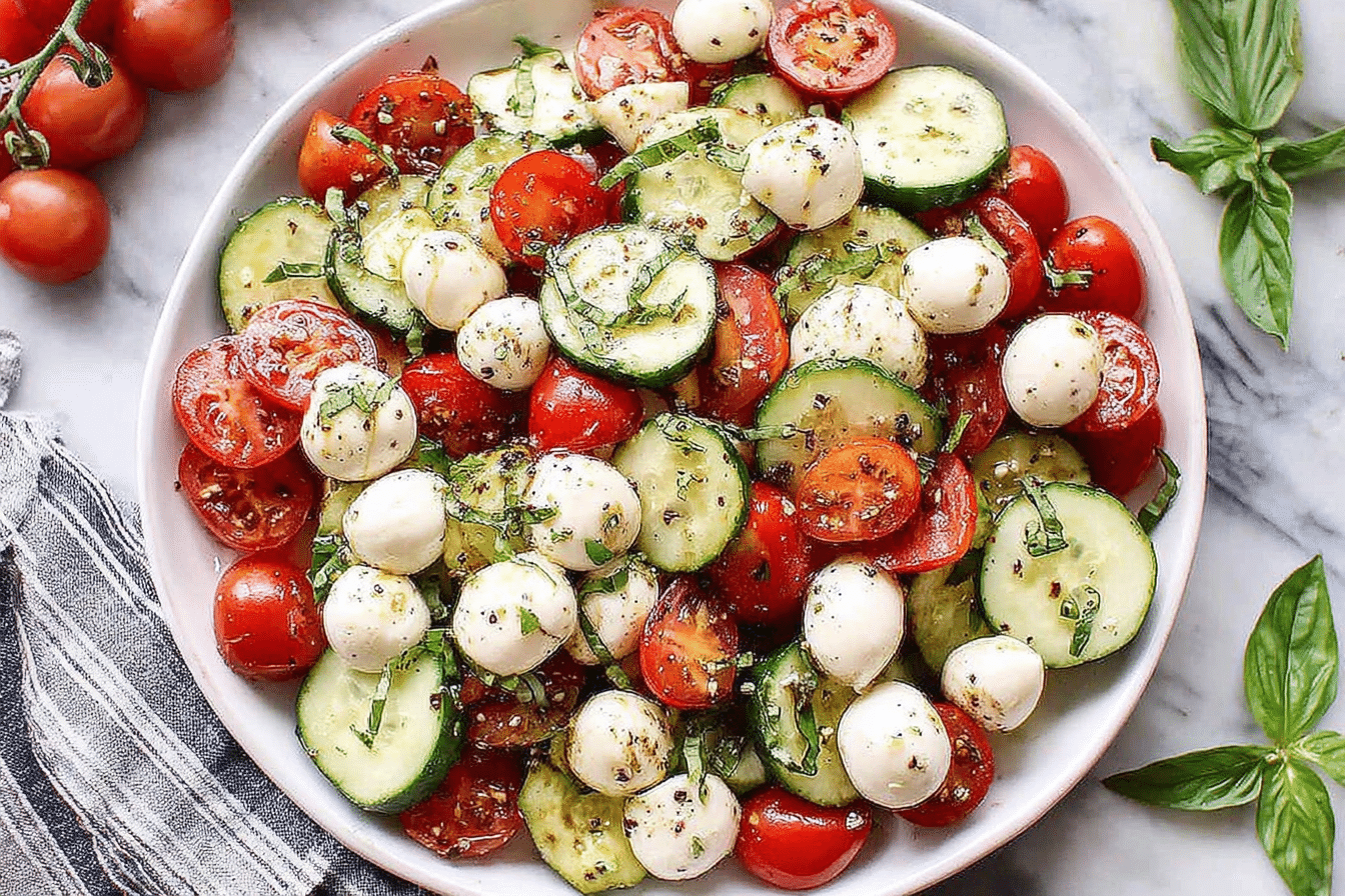 The result is a salad that feels clean, vibrant, and satisfying without being heavy. Fresh Cucumber Caprese Salad works beautifully as a quick side dish, yet it is flavorful enough to stand out on any table. With minimal preparation and simple ingredients, it highlights how fresh produce can shine when treated with care.