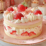 A soft and airy strawberry cream cake layered with whipped cream and fresh strawberries, perfect for light and elegant desserts.