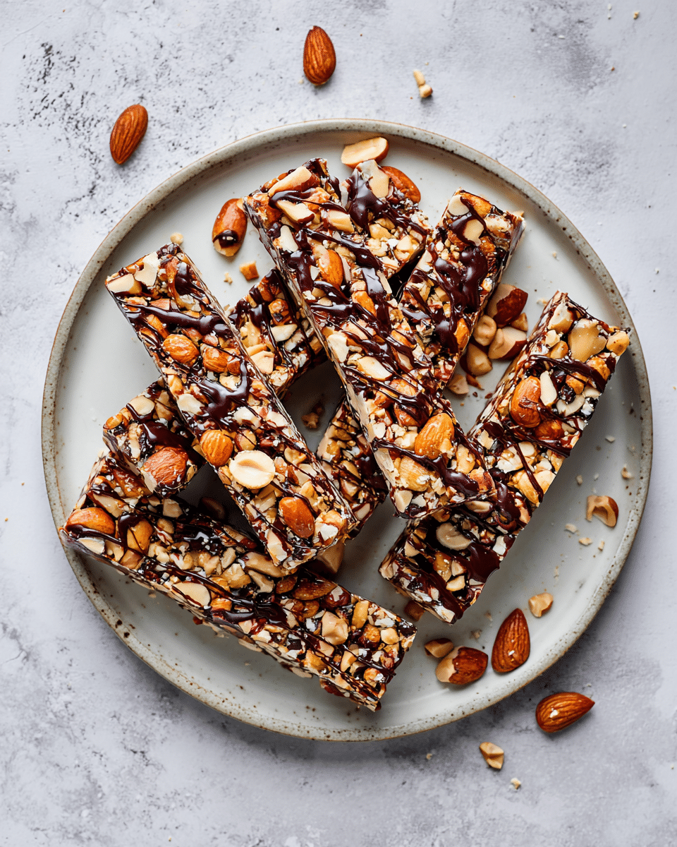 Crunchy, chewy nut bars topped with rich dark chocolate and flaky sea salt. Naturally sweetened, no-bake, and packed with healthy fats and protein.