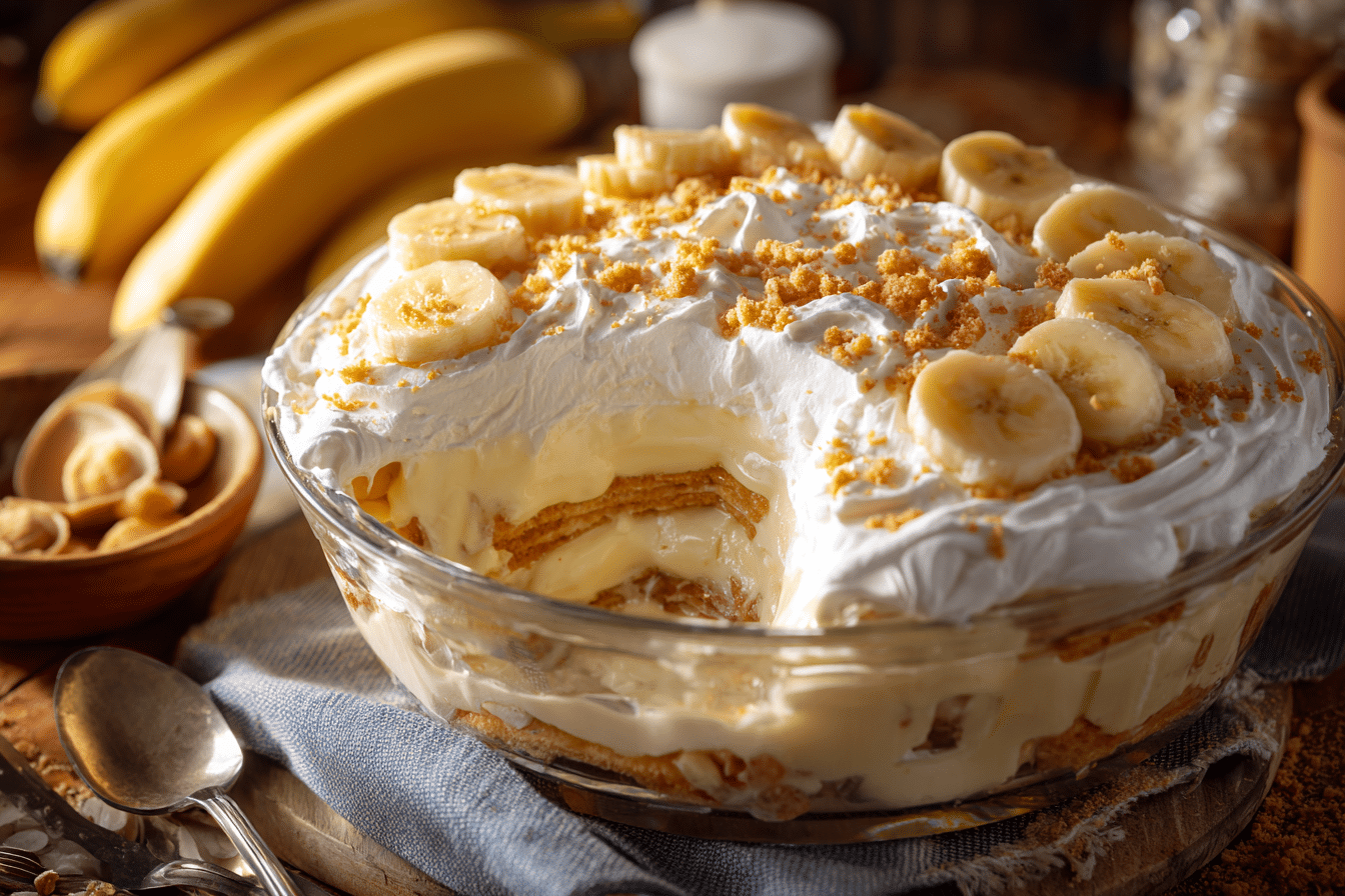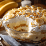 This version is quick, simple, and perfect for feeding a group. It combines instant pudding mix, sweetened condensed milk, whipped topping, and ripe bananas to create silky layers that come together in under 20 minutes. The magic happens as the wafers soften slightly, blending into the creamy pudding for a texture that’s smooth and spoonable with every bite. It’s a dessert that gets better as it sits—if you can wait that long.