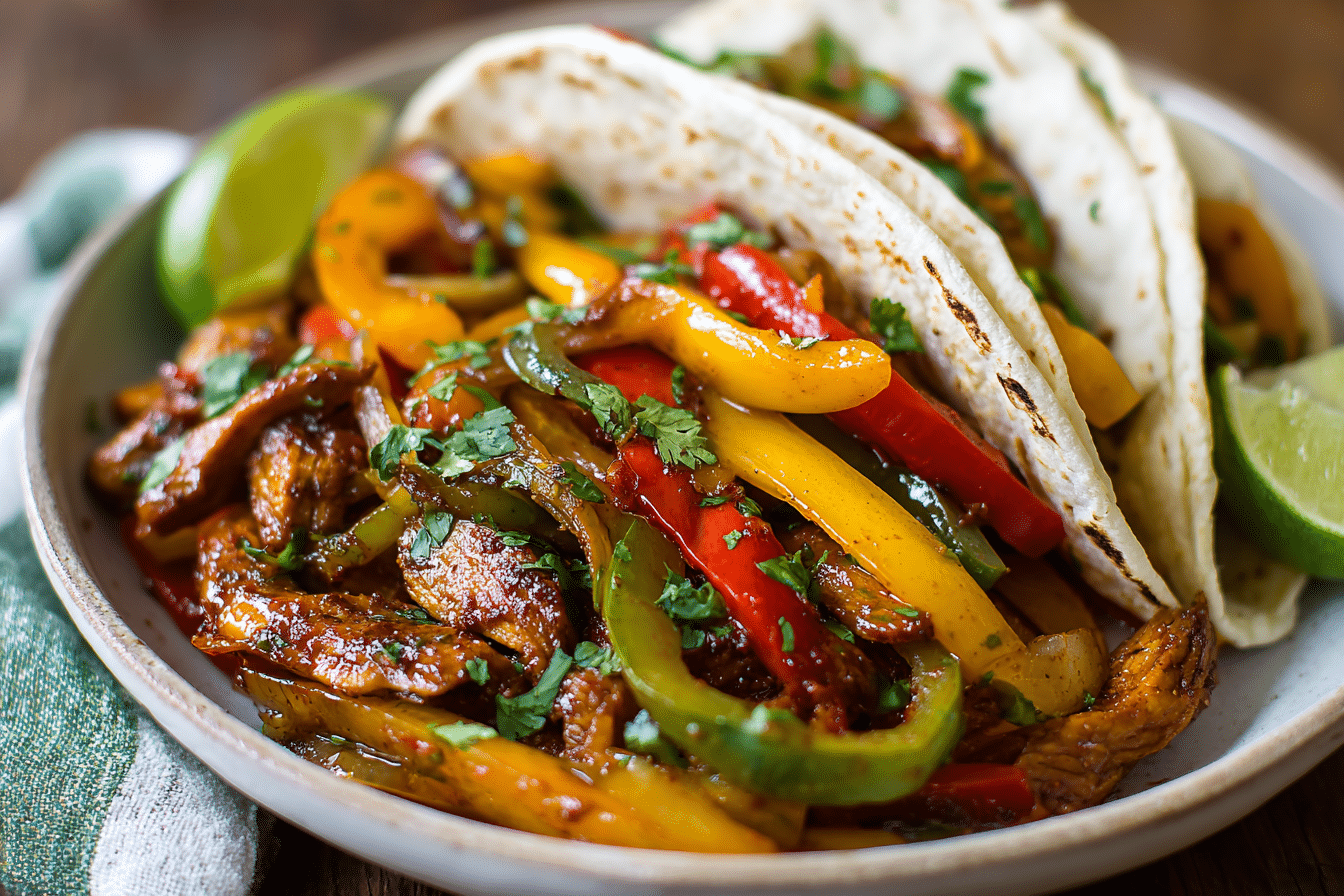 1.5 pounds boneless, skinless chicken breasts or thighs (or beef strips), 3 bell peppers sliced, 1 medium onion sliced, 3 cloves garlic minced, 2 tablespoons olive oil, 1 tablespoon chili powder, 1 teaspoon cumin, 1 teaspoon smoked paprika, 1/2 teaspoon onion powder, 1/2 teaspoon garlic powder, 1/2 teaspoon salt, 1/4 teaspoon black pepper, juice of 1 lime, 2 tablespoons fresh cilantro chopped, optional toppings: shredded cheese, sour cream, guacamole, salsa, 8–10 flour or corn tortillas