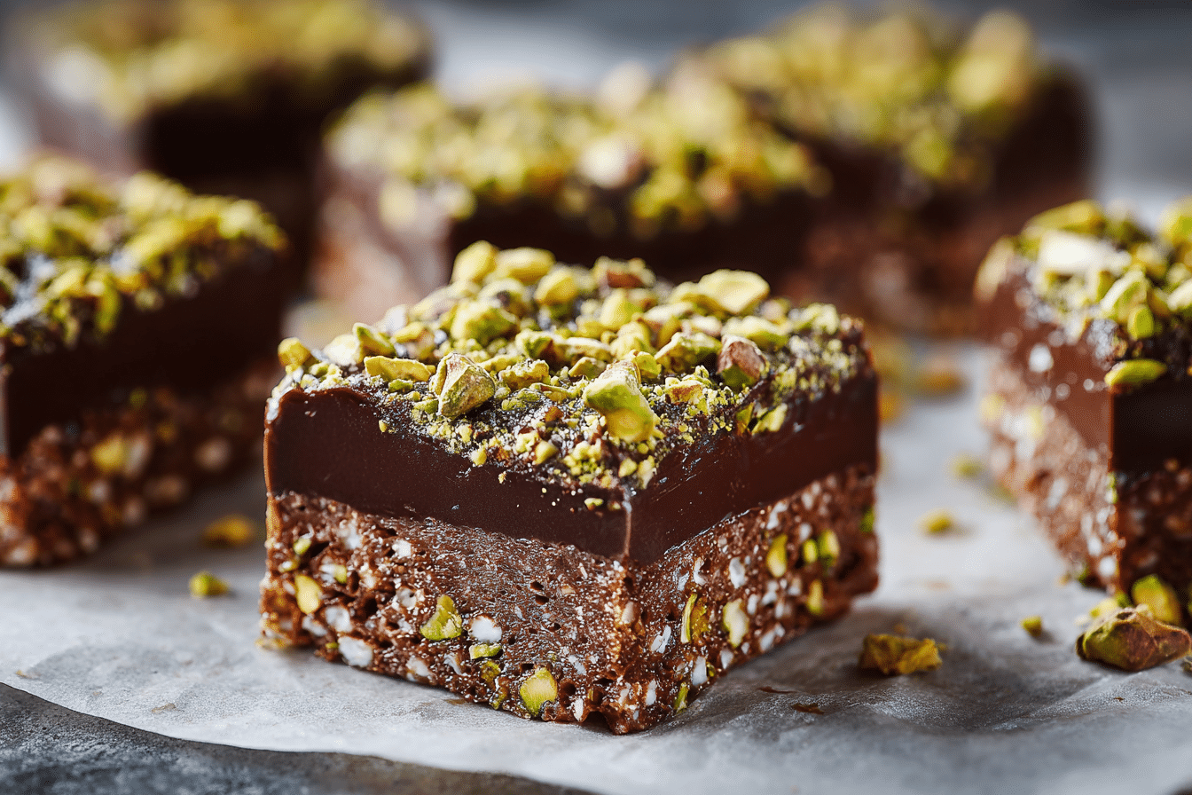 A no-bake chocolate Rice Krispie treat inspired by Dubai flavors, made with creamy pistachio butter, dark chocolate, and optional floral or spiced notes. Rich, chewy, and elegant.