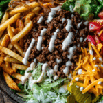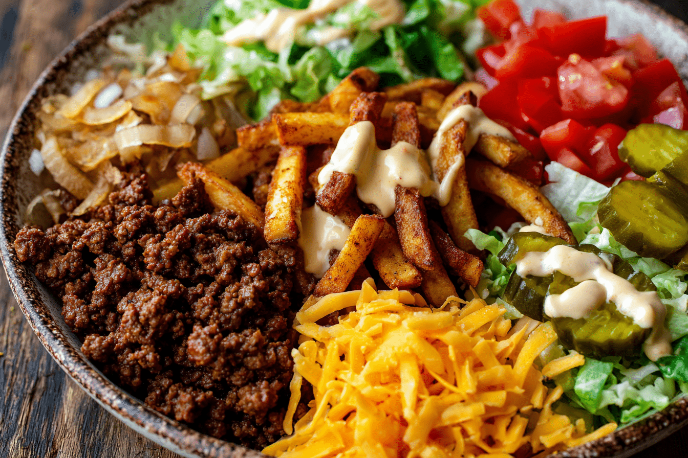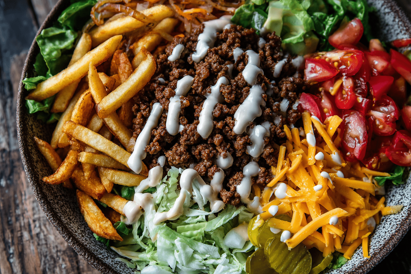Burger Bowls deliver all the classic flavors of a juicy burger without the bun, layered into a fresh and satisfying bowl. They combine seasoned ground beef, crisp lettuce, ripe tomatoes, crunchy pickles, and a creamy sauce for a meal that feels hearty yet balanced.