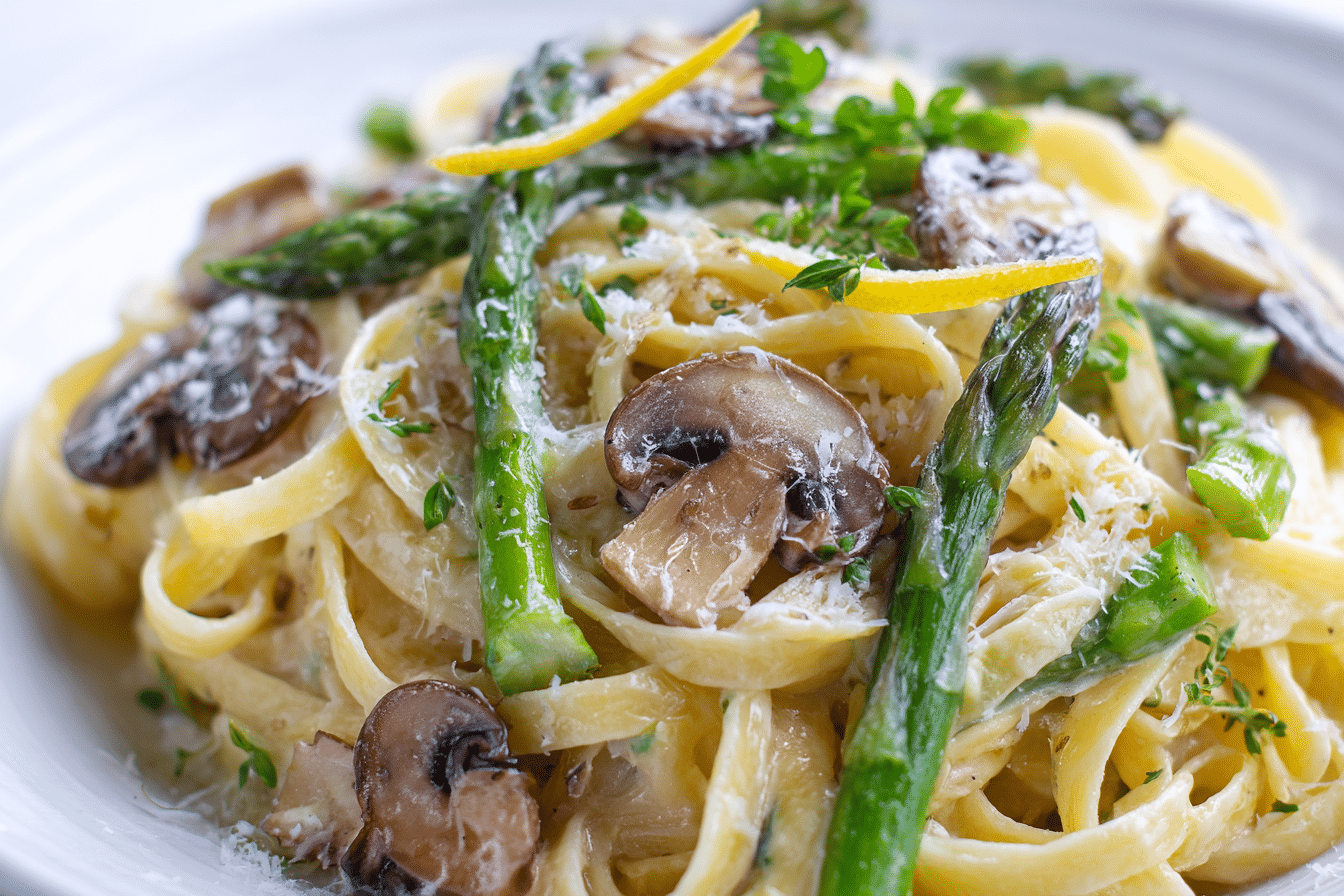 Asparagus and mushrooms are the star vegetables in this dish. Asparagus contributes tender, slightly crisp stalks with a subtle earthy sweetness, while mushrooms add a deep umami flavor and meaty texture. Garlic enhances the aromatic base, while olive oil or butter provides richness. Lemon juice and zest brighten the dish and balance the creaminess of the sauce.