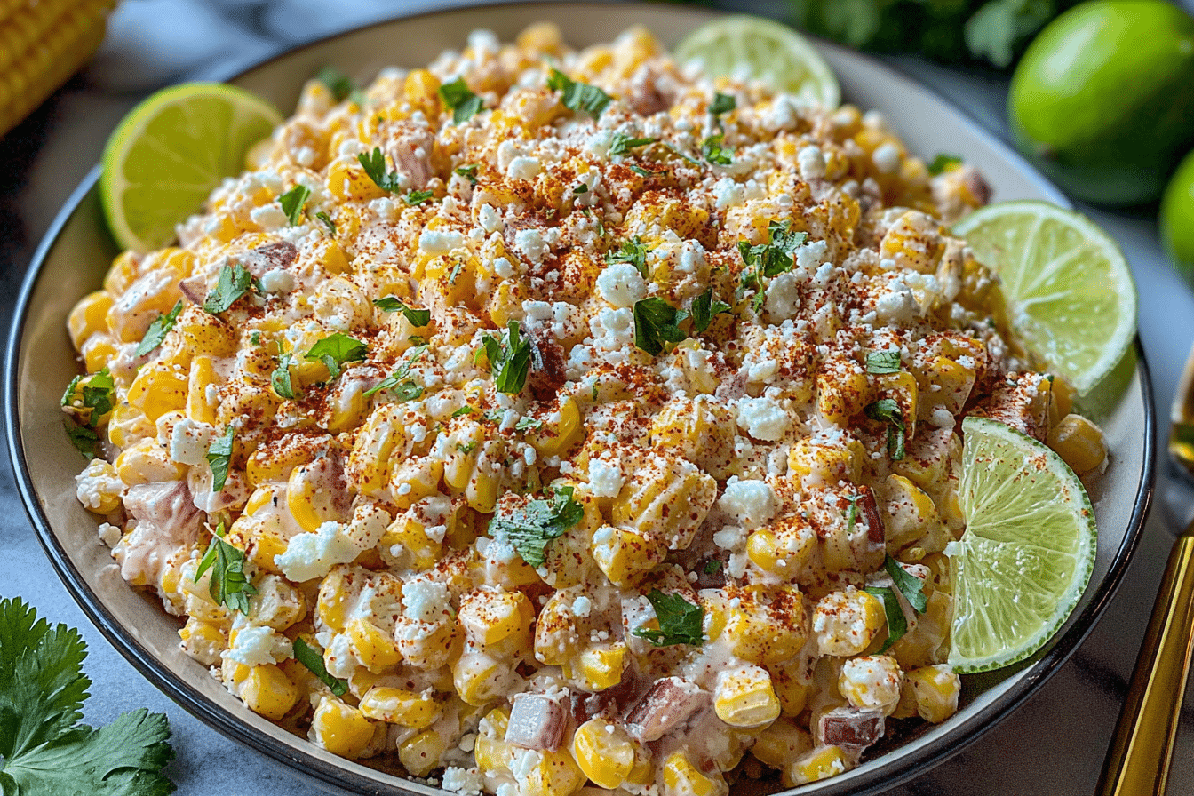 A creamy and flavorful corn salad inspired by Mexican street corn, featuring lime, cheese, and spices.