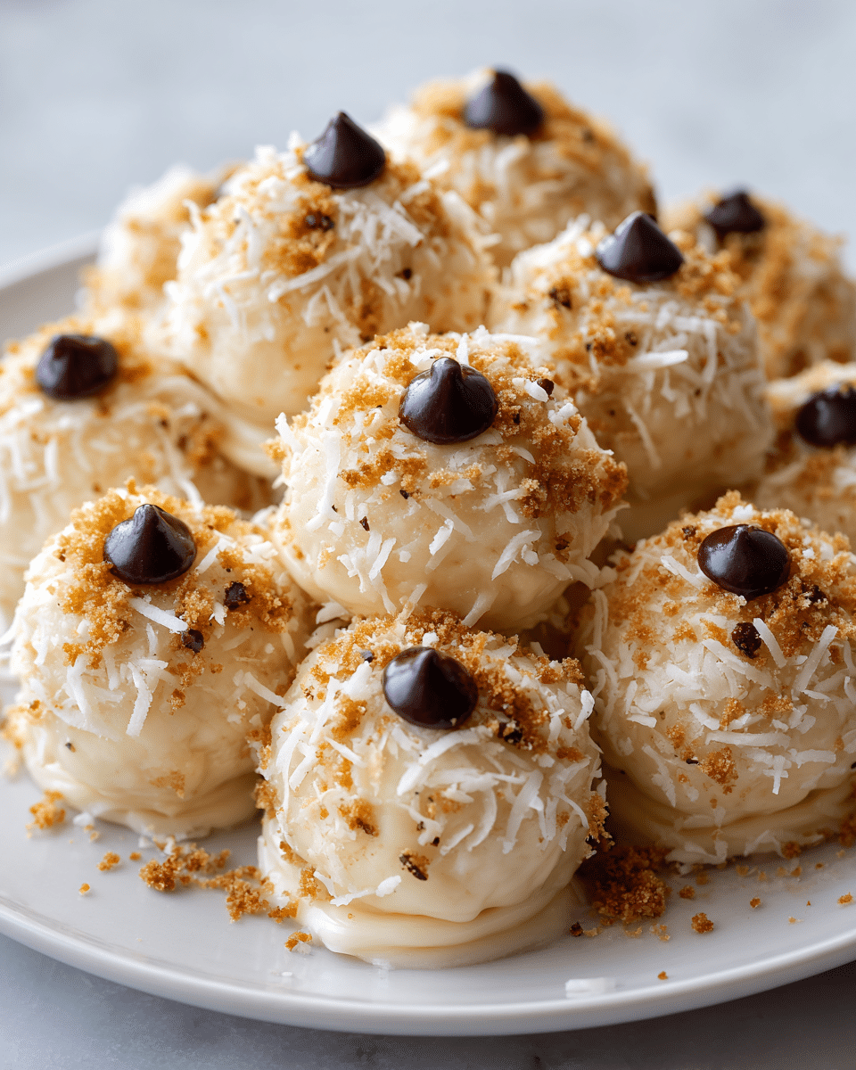 These little round bites are made from sweetened condensed milk, graham cracker crumbs, shredded coconut, and mini chocolate chips, then rolled in more coconut or left plain. They’re chilled until firm and chewy, creating a rich, sweet flavor with a soft texture and a slight crunch.