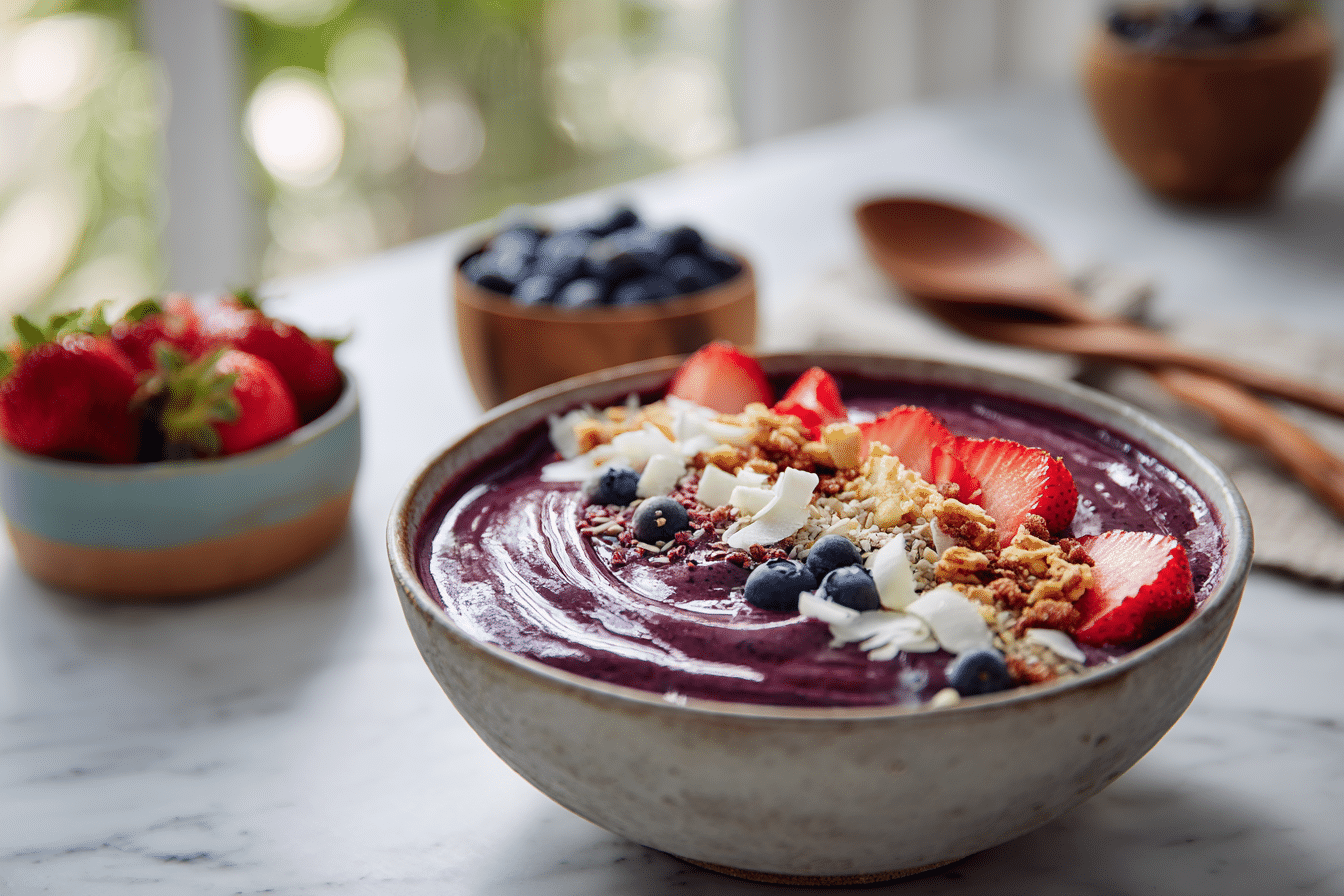 Acai berries bring a deep purple color and a mild berry flavor that pairs beautifully with many fruits. When blended with ingredients such as banana, berries, or mango, the mixture becomes creamy and naturally sweet. The bowl is then topped with fresh fruit, crunchy granola, and other simple additions that add texture and visual appeal.
