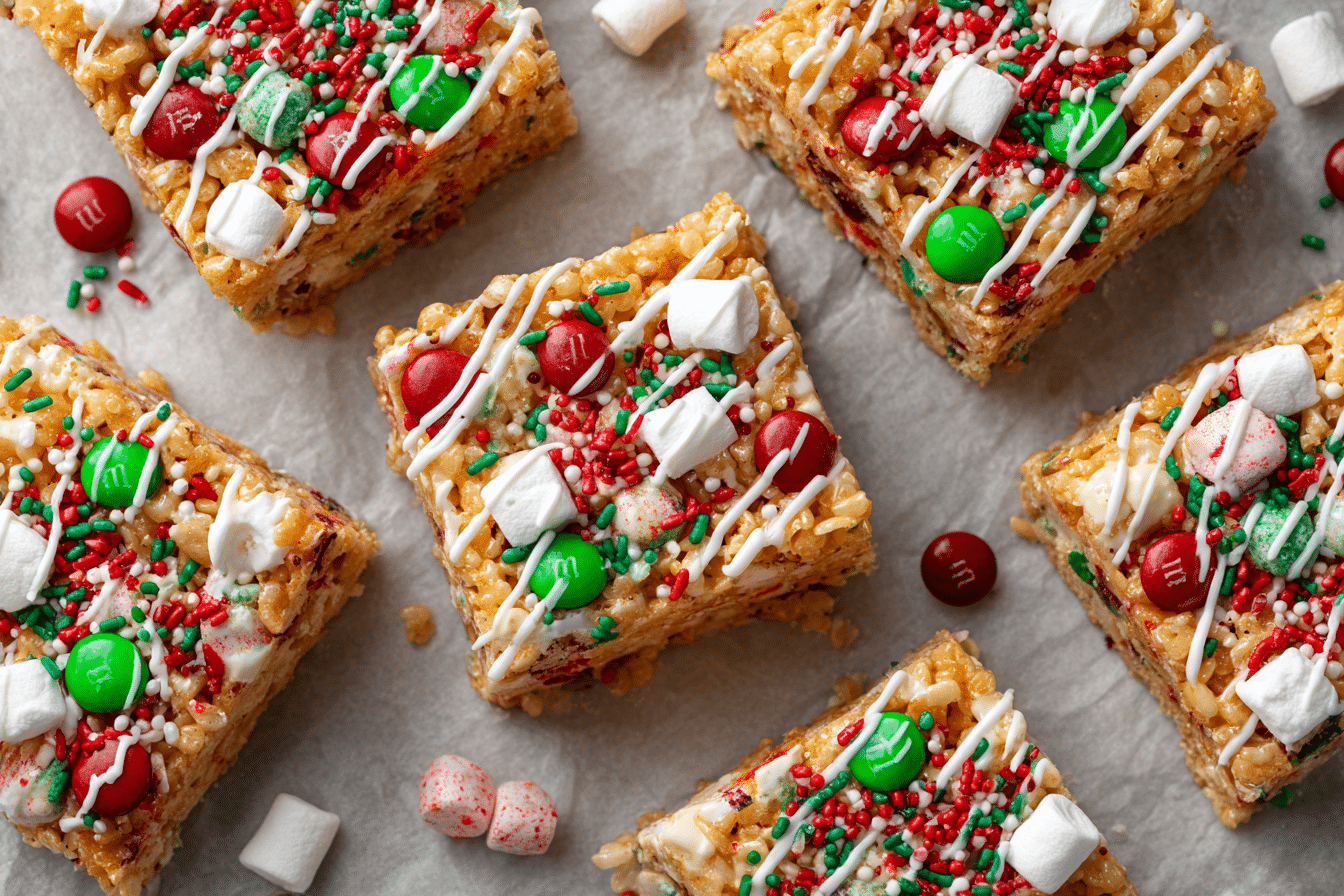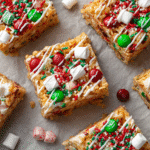 These Christmas Rice Crispy Treats are soft, chewy, and loaded with festive flair — perfect for holiday parties, edible gifts, or a no-bake family dessert.