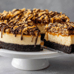 Inspired by the iconic Girl Scout cookie, this Samoa Cheesecake brings together everything you love about the classic treat — a buttery cookie crust, rich caramel, toasted coconut, and drizzled chocolate — layered over a creamy, baked cheesecake filling.