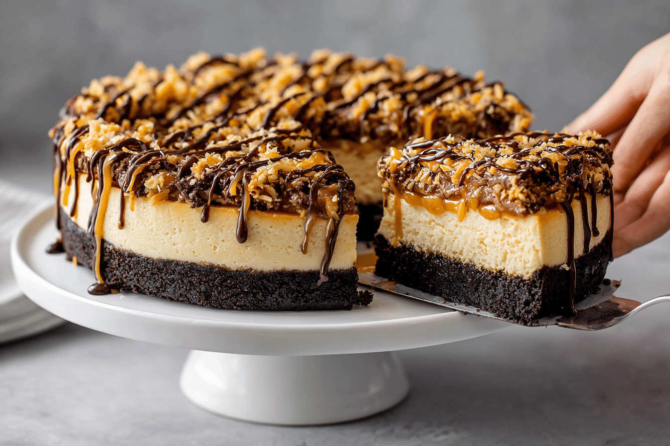 This Samoa Cheesecake combines a buttery crust, creamy vanilla filling, toasted coconut, gooey caramel, and chocolate drizzle — a rich and elegant dessert inspired by the beloved Girl Scout cookie.