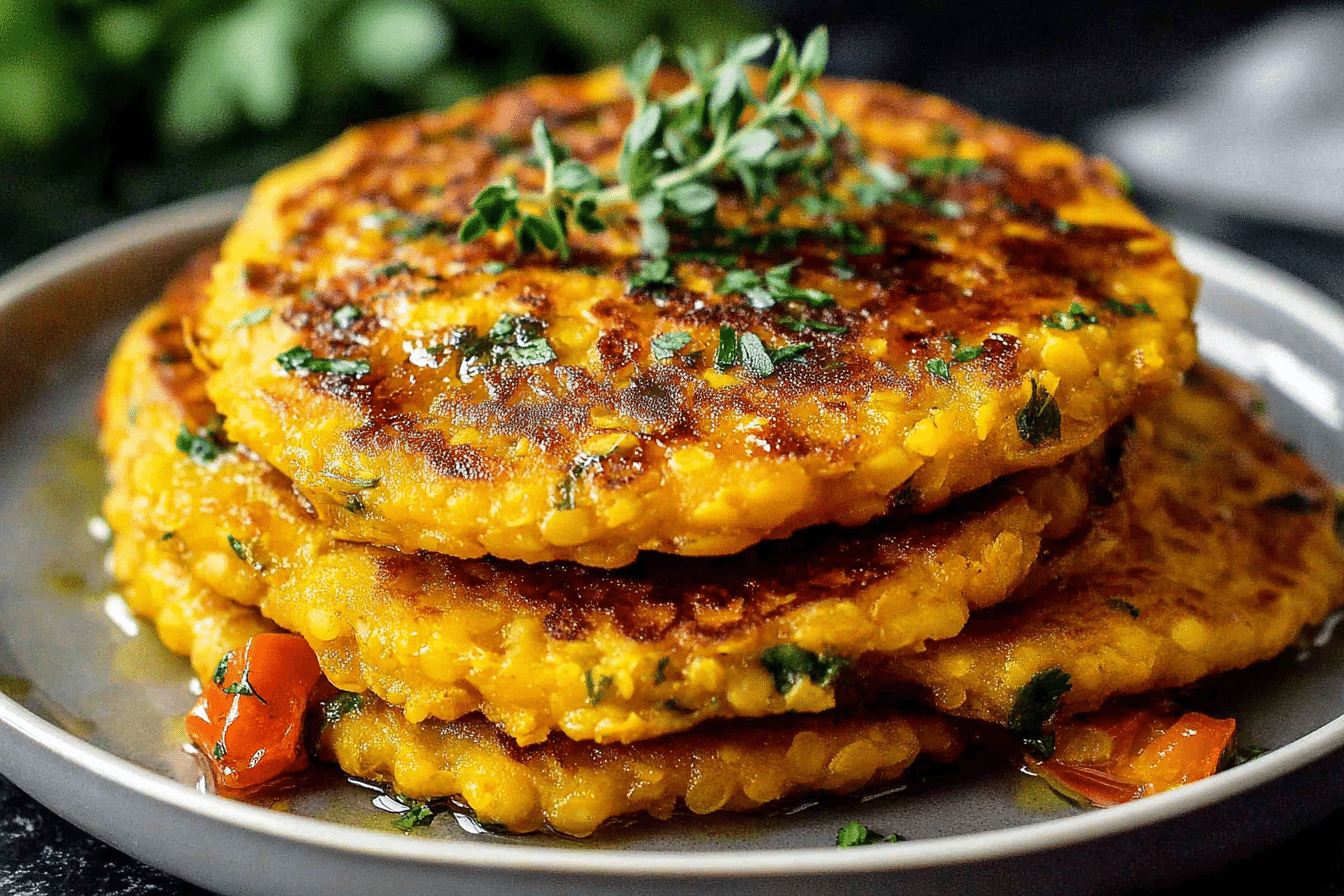 Protein-packed and fiber-rich red lentil pancakes with vegetables and herbs, crispy on the outside and tender on the inside, perfect for breakfast or snacks.