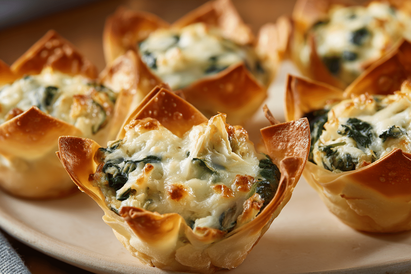 Each cup features a golden wonton shell baked until lightly crisp, holding a rich blend of spinach, artichokes, and three cheeses. The contrast between the crunchy wrapper and the velvety center creates a balanced texture that keeps guests reaching for more.