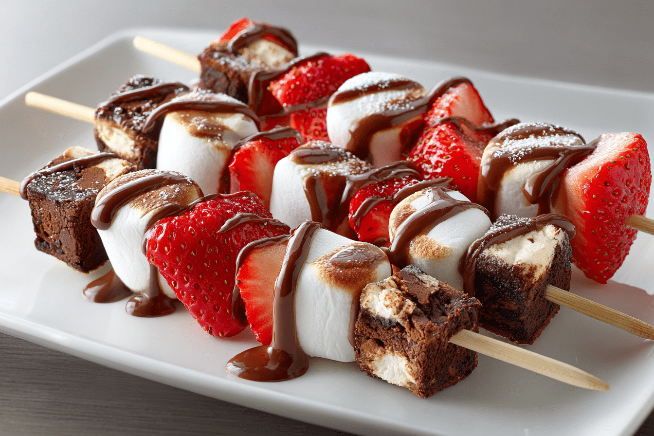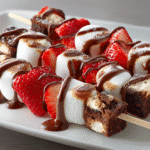 Strawberry brownie kabobs are a fun and festive dessert made with fudgy brownies, fresh strawberries, marshmallows, and a drizzle of melted chocolate — perfect for parties or sweet snacks.