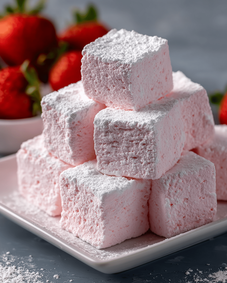 Fluffy, fruity strawberry pink marshmallows made with real strawberry puree and no artificial dyes. A sweet, no-bake treat perfect for gifting, snacking, or hot cocoa.