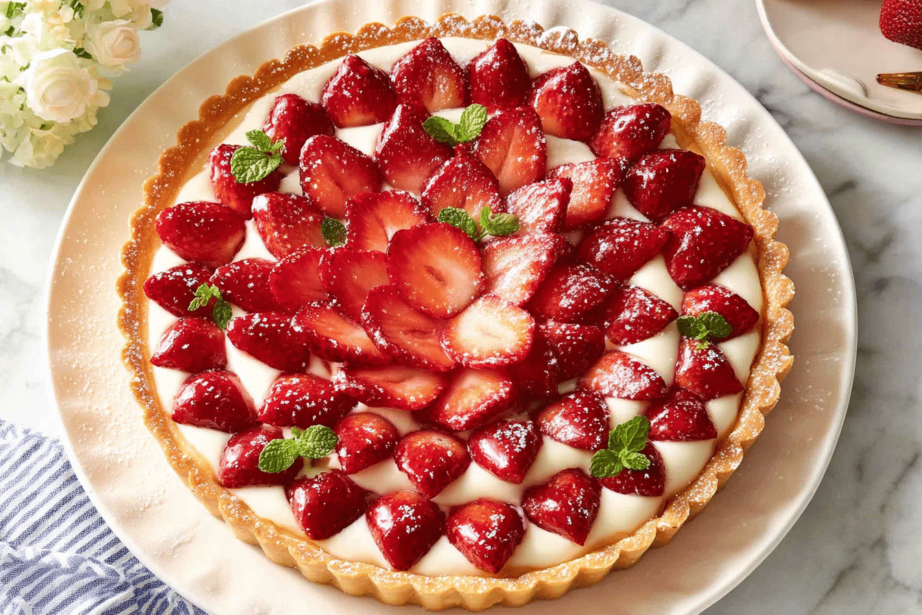 Tarte aux fraises fleur is ideal for spring and summer gatherings when strawberries are at their peak. It pairs beautifully with lightly sweetened whipped cream, a dollop of crème fraîche, or a scoop of vanilla ice cream. Champagne or sparkling rosé complements the tart’s fruity freshness, while a fragrant herbal tea like chamomile or mint provides a delicate balance for a non-alcoholic option.