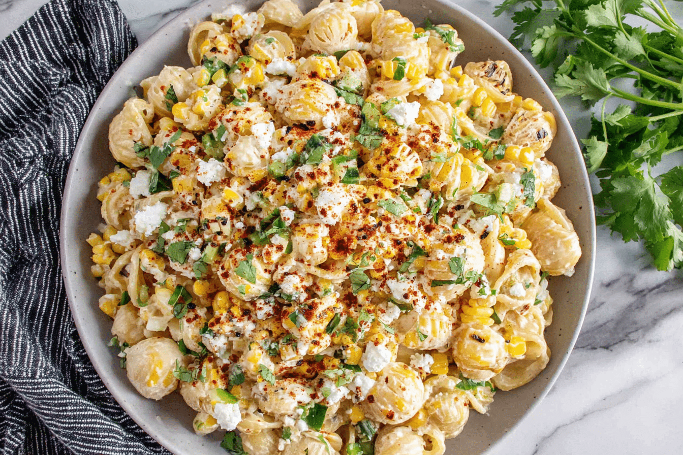 Healthy Street Corn Pasta Salad is a creamy, tangy dish made with pasta, sweet corn, and a light yogurt-based dressing inspired by street corn flavors.