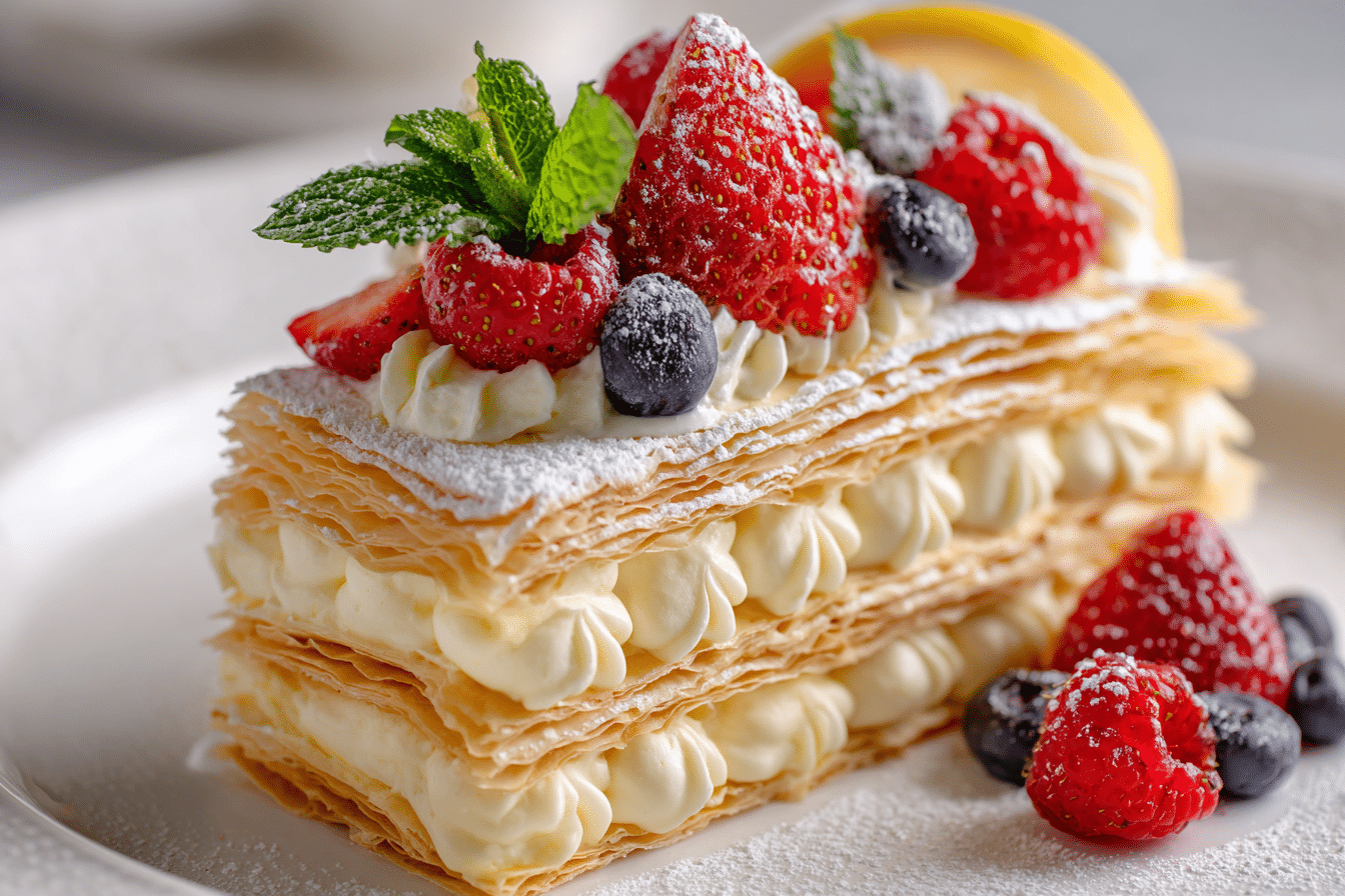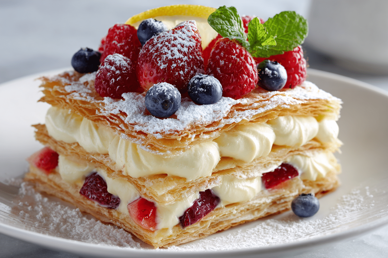 An elegant, no-fuss dessert featuring crisp puff pastry, airy whipped cream, and fresh berries layered into a chilled cake. Perfect for brunches and celebrations.