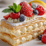 When you need a dessert that looks stunning, tastes luxurious, and takes minimal effort, this puff pastry berry cream cake checks every box. Light, crisp pastry layers sandwiching fluffy whipped cream and sweet, juicy berries—it’s a showstopper that feels elegant yet simple. The contrast of buttery pastry, airy cream, and tart-sweet fruit makes every bite refreshing and indulgent.